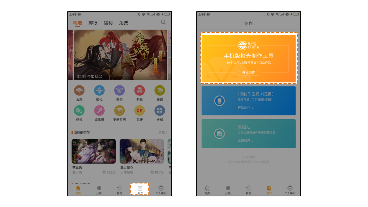 首先,打开橙光APP,没有橙光APP请到(网址)下载。登录之后,点击【制作】,选择【轻橙全新手机在线制作】。如下图所示: