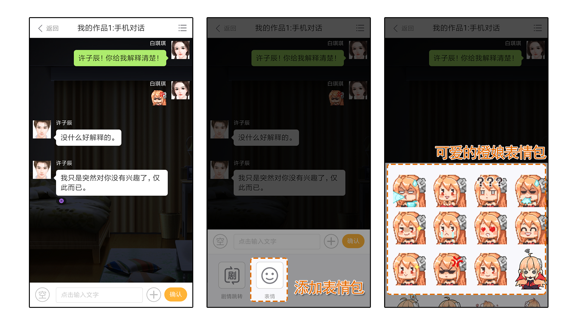 对话模式类似于QQ、微信等聊天工具的对话模式,还可以点击【表情】添加萌萌的橙娘表情包。