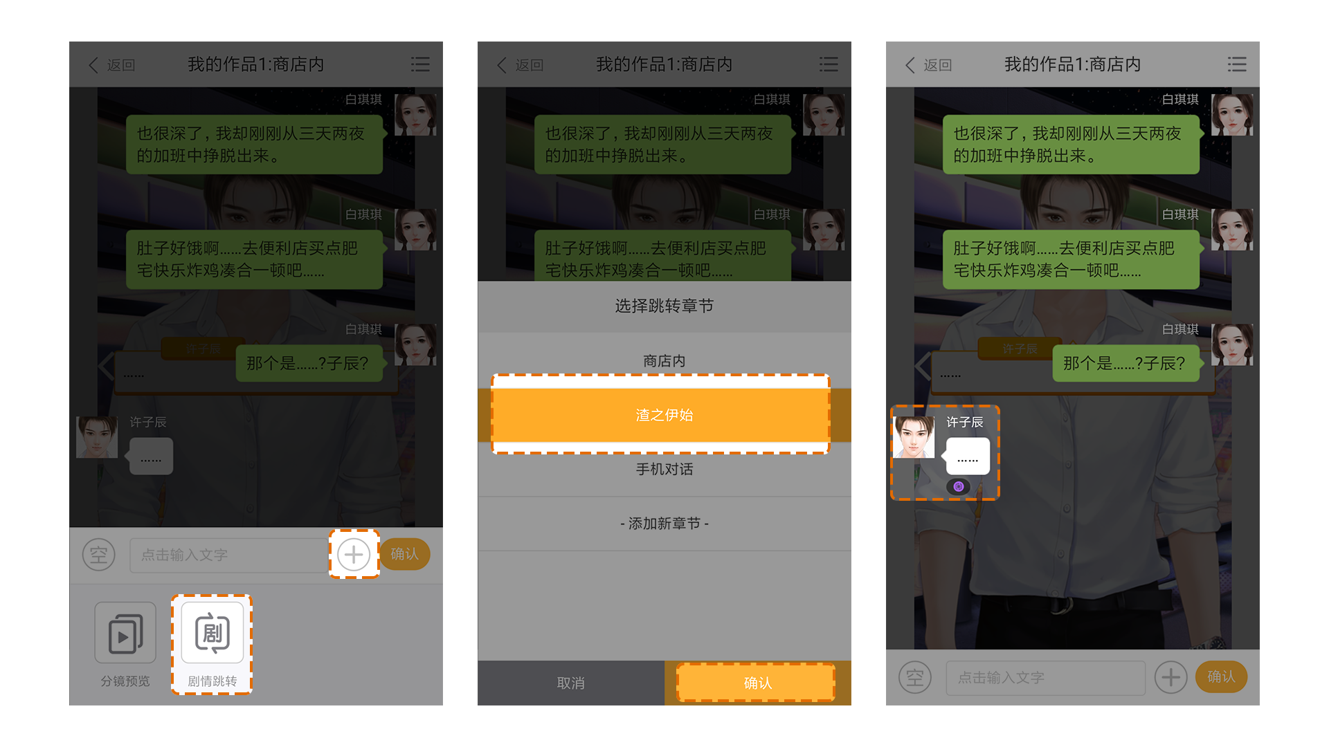 点击第一个章节的最后一段对话,在下面的“+”号中,找到“剧情跳转”,选择想要跳转到的剧情,点击确定。