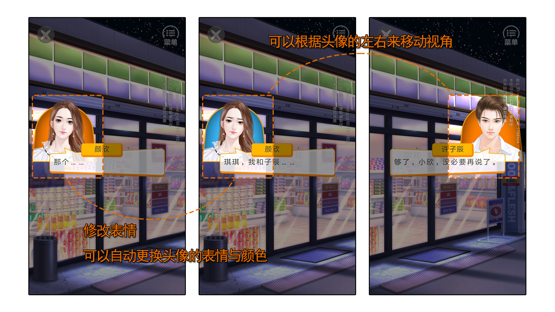 视觉模式可以通过点击【表情】,更改角色的头像表情和背景色。镜头还会跟着角色的头像位置左右移动。