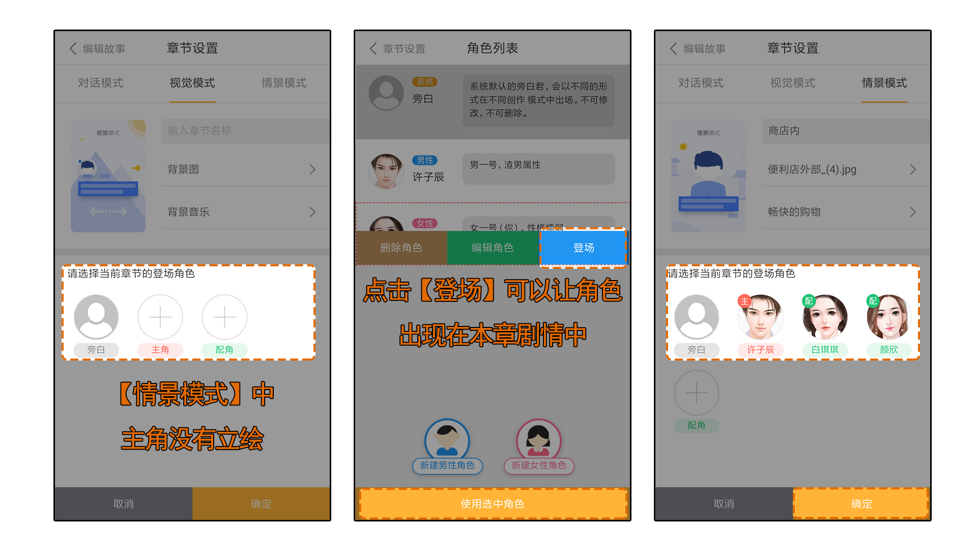 登场角色分为主角与配角,点击新建角色,可以设置角色名、角色简介以及角色立绘。