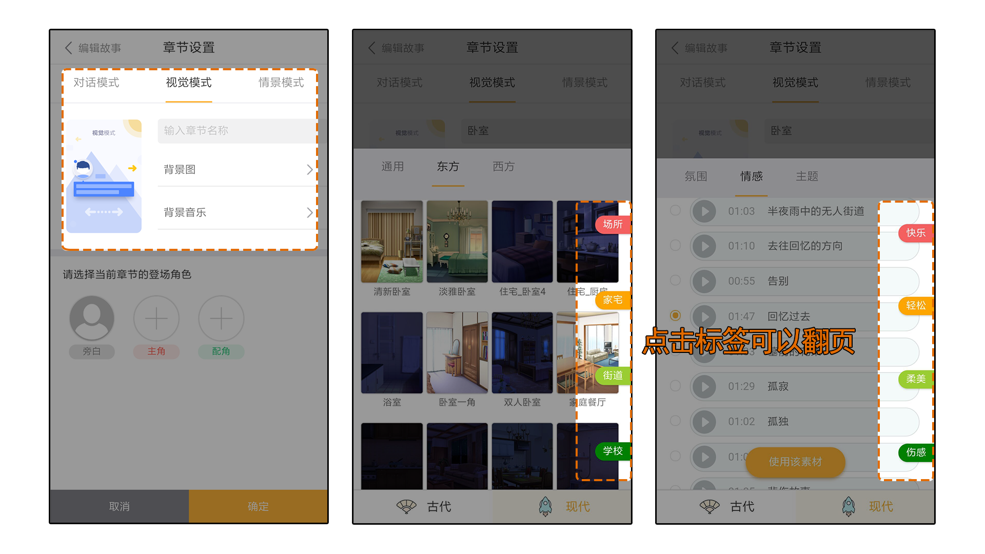 添加当前章节的名称、背景图、背景音乐。背景图片与音乐右侧的小标签可以翻页查找想要的素材;