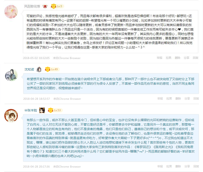 至此,本期五月总结刊的内容就全部结束了,是不是还有些意犹未尽呢?如果你还想为自己喜欢的作品、作者疯狂打call,如果你对橙光还有想说的话,都欢迎大家在评论区畅所欲言。我们将精选出三个小可爱的评论并送出5朵鲜花,还会在六月刊中进行展示哦~