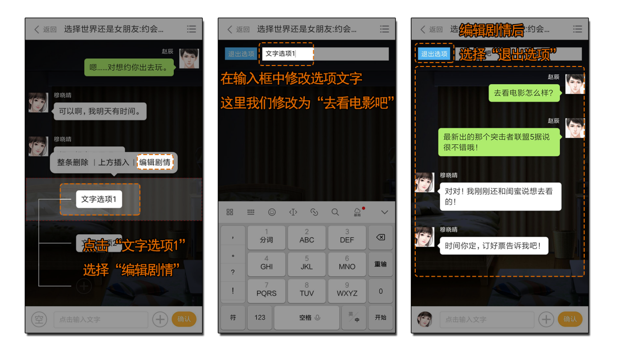 第三步:编辑对话,内容为男主角邀请女主角去看电影;编辑完成后,点击“退出选项”;
