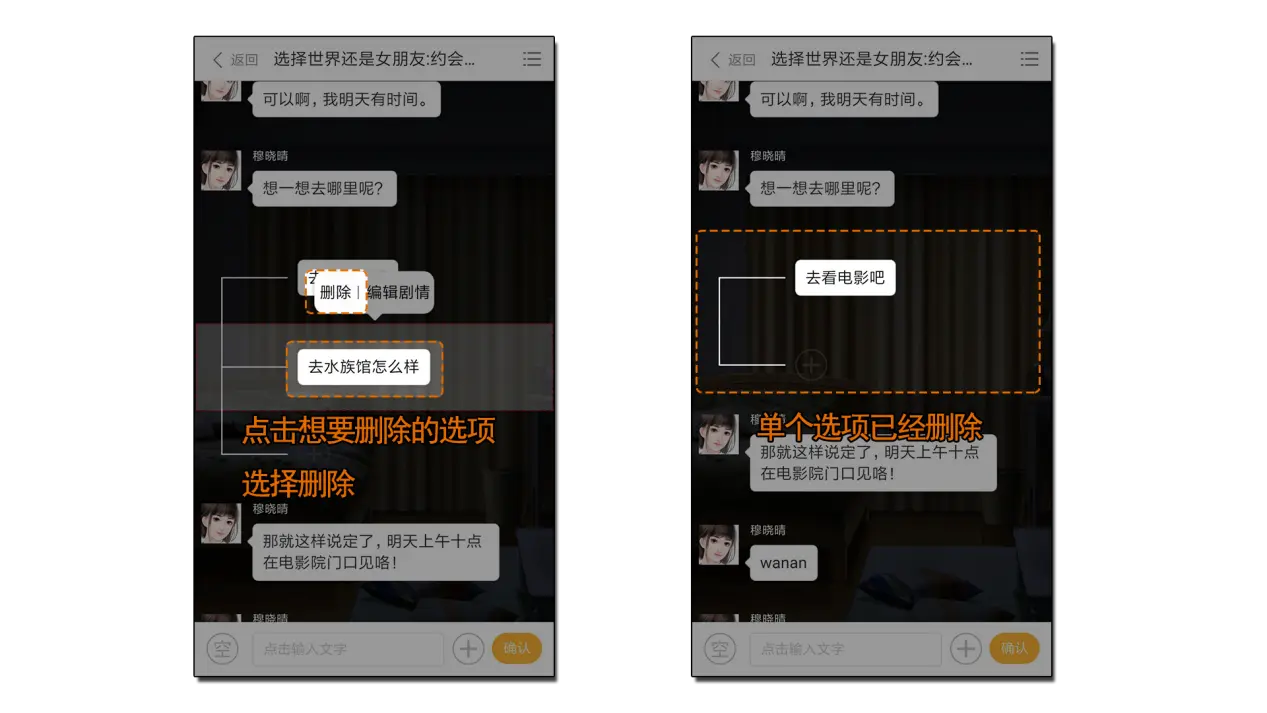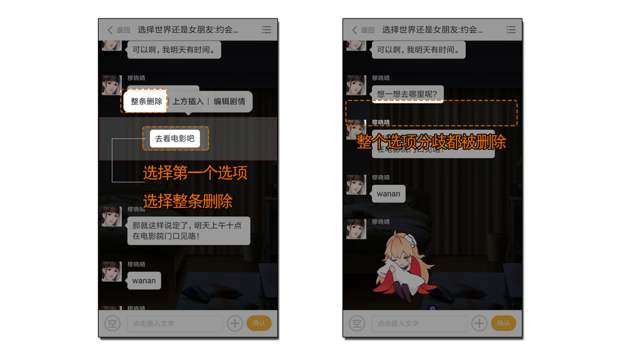 点击选项,选择删除就可以删除选项。如果点击第一个选项,就可以将整个选项分歧全部删除。注意!如果删除了选项,那么选项内的所有剧情也都将要删除,无法修复!请务必注意!