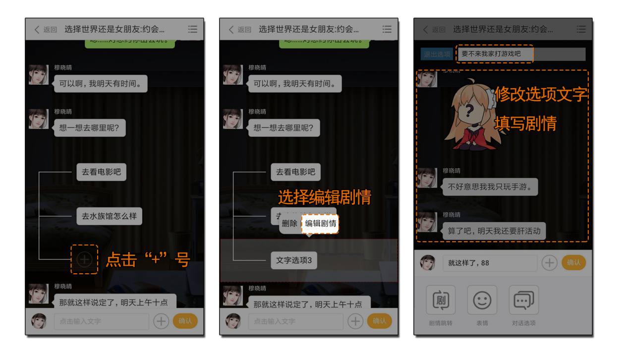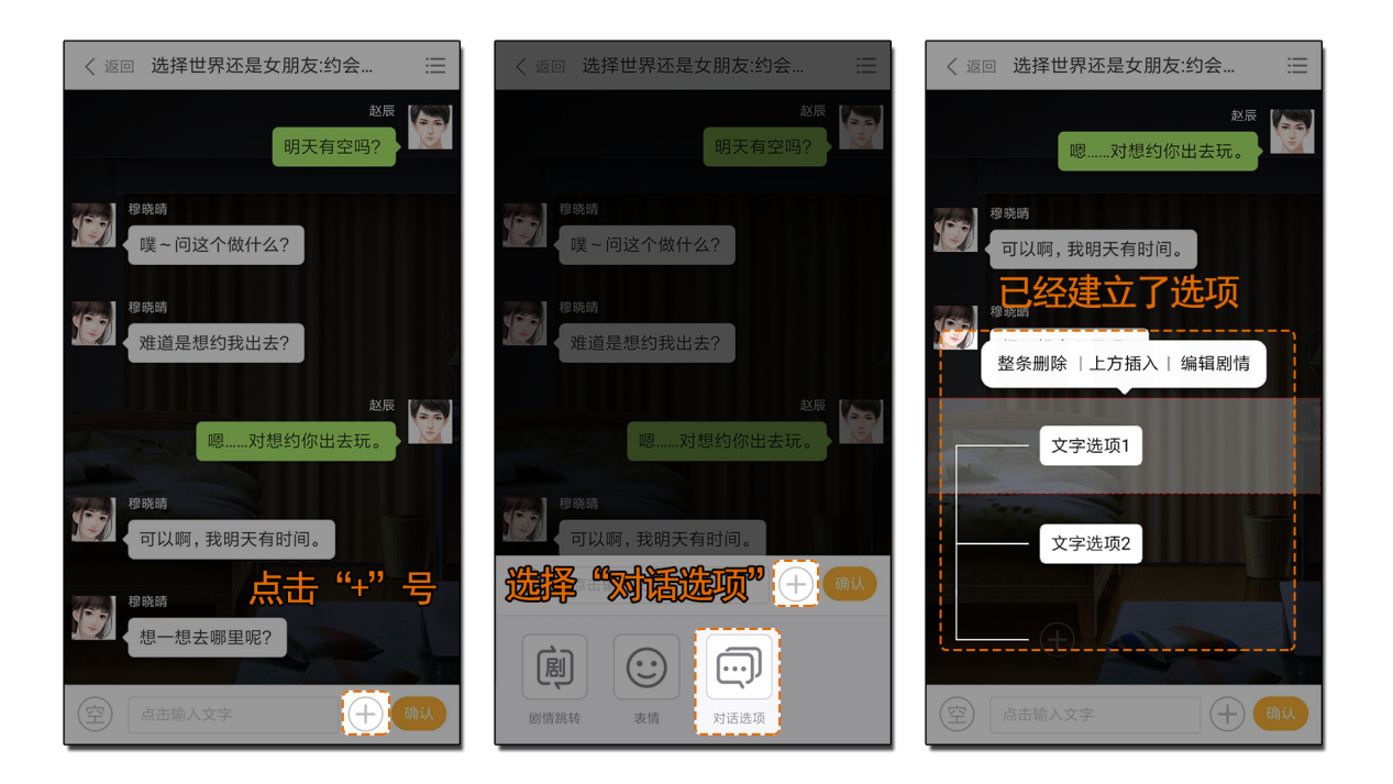 在想要添加选项的位置,点击“+”号,选择“对话选项”,就可以在剧情中添加一个拥有两个选项的选项区。一个选项区中默认有两个选项,最多可以扩展至三个。