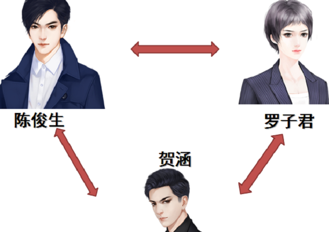 如上图所示,陈俊生是女主角罗子君的前夫,贺涵是罗子君离婚后与她产生感情纠葛的人,而贺涵是陈俊生的新任上司,在工作上挟持于陈俊生。于是这三个人单独也能构成一个三角关系。