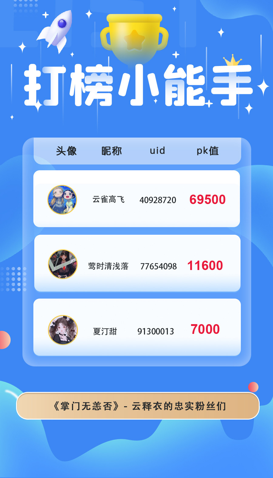 本月在大家的热情打投下胜出的是:云释衣、李辰彦、了不起的你,恭喜他们啦!