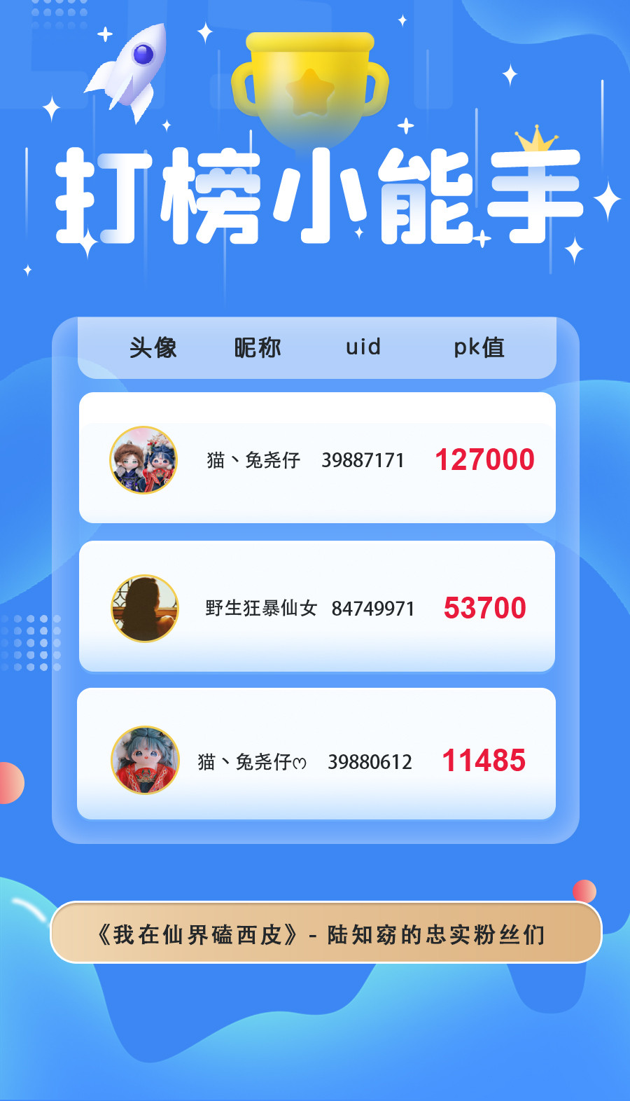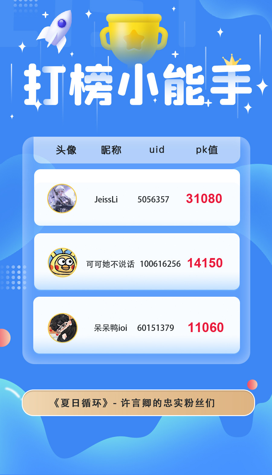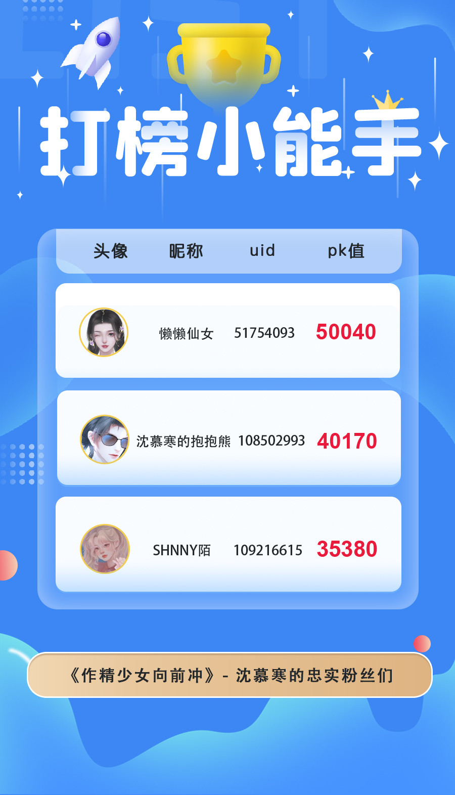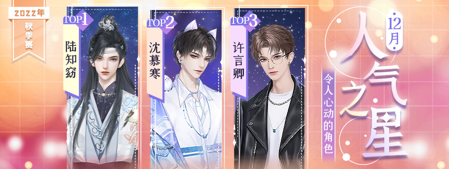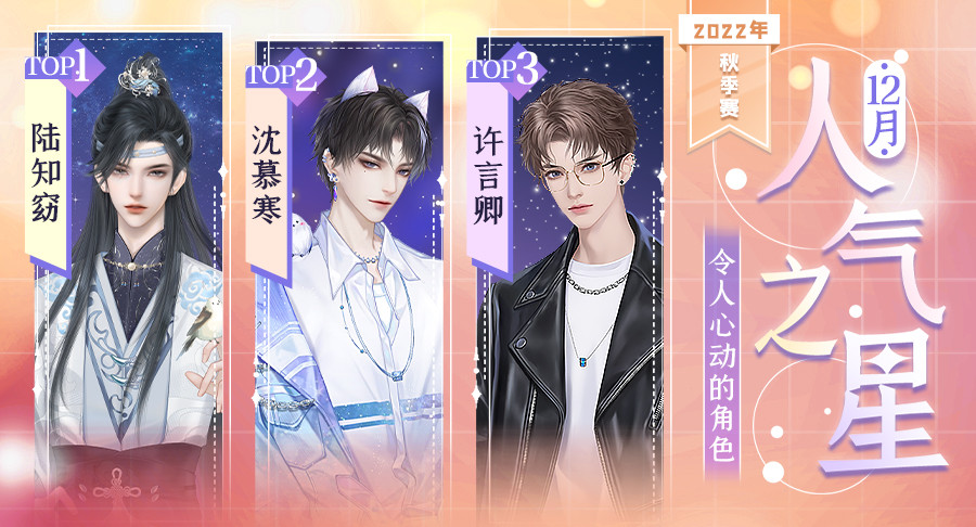 本月在大家的热情打投下胜出的是:陆知窈、沈慕寒、许言卿,恭喜他们啦!
