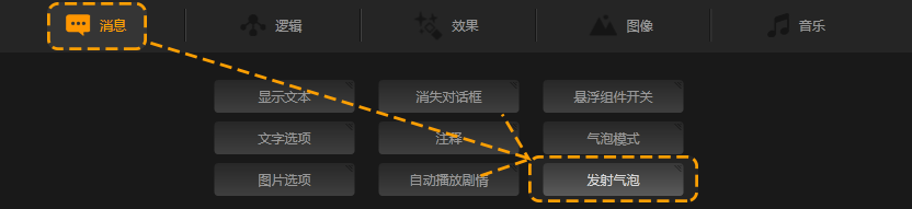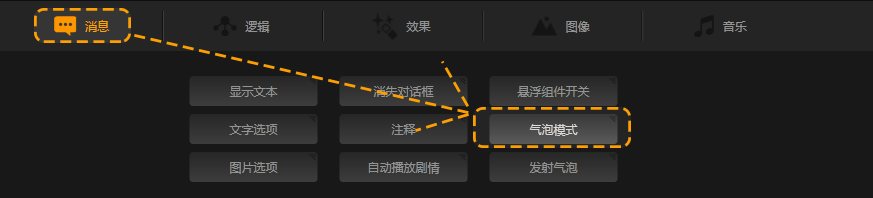 使用2.0最新版制作工具中气泡功能与发射气泡功能,来实现对话模式的操作。