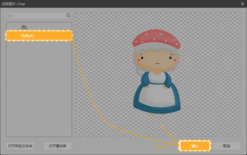 第十五步,添加图片时,先将素材放置到工程文件夹中的“Graphics-Chat”文件夹下。