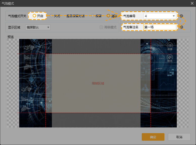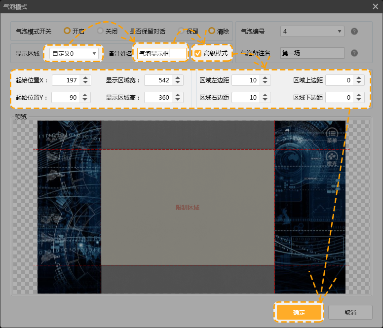 第十步,点击显示区域,选择“自定义0”,将备注姓名更改为“气泡显示框”,勾选高级模式前面的方块,调整“限制区域”与气泡显示底图一致,点击“确定”。