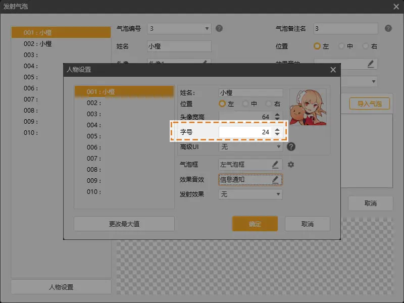 注:最新版工具在“人物设置”中新增一个“字号”,可用来调整气泡中的文字大小。