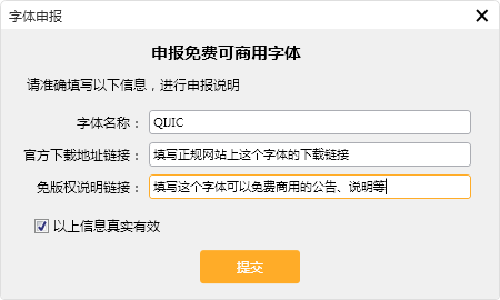 第三步:填写申报字体的相关信息,并确认勾选以上信息真实有效,然后点击提交。字体名称建议不要手动修改,否则可能会出现即使申报通过也无法使用的情况。