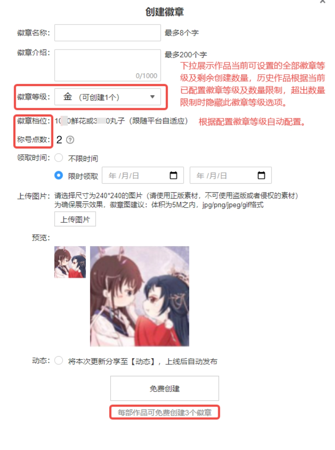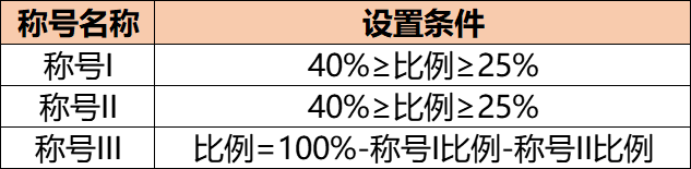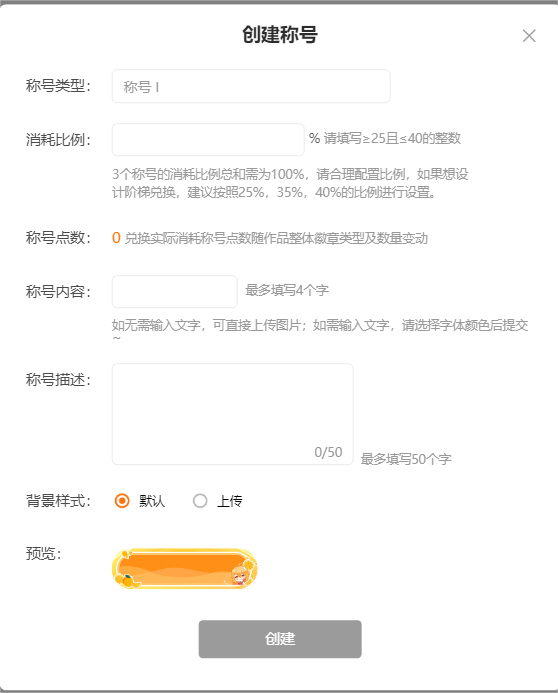 2.消耗比例:设置百分比,兑换称号所需称号点数,根据作品徽章总称号点数和设置的百分比自动计算。