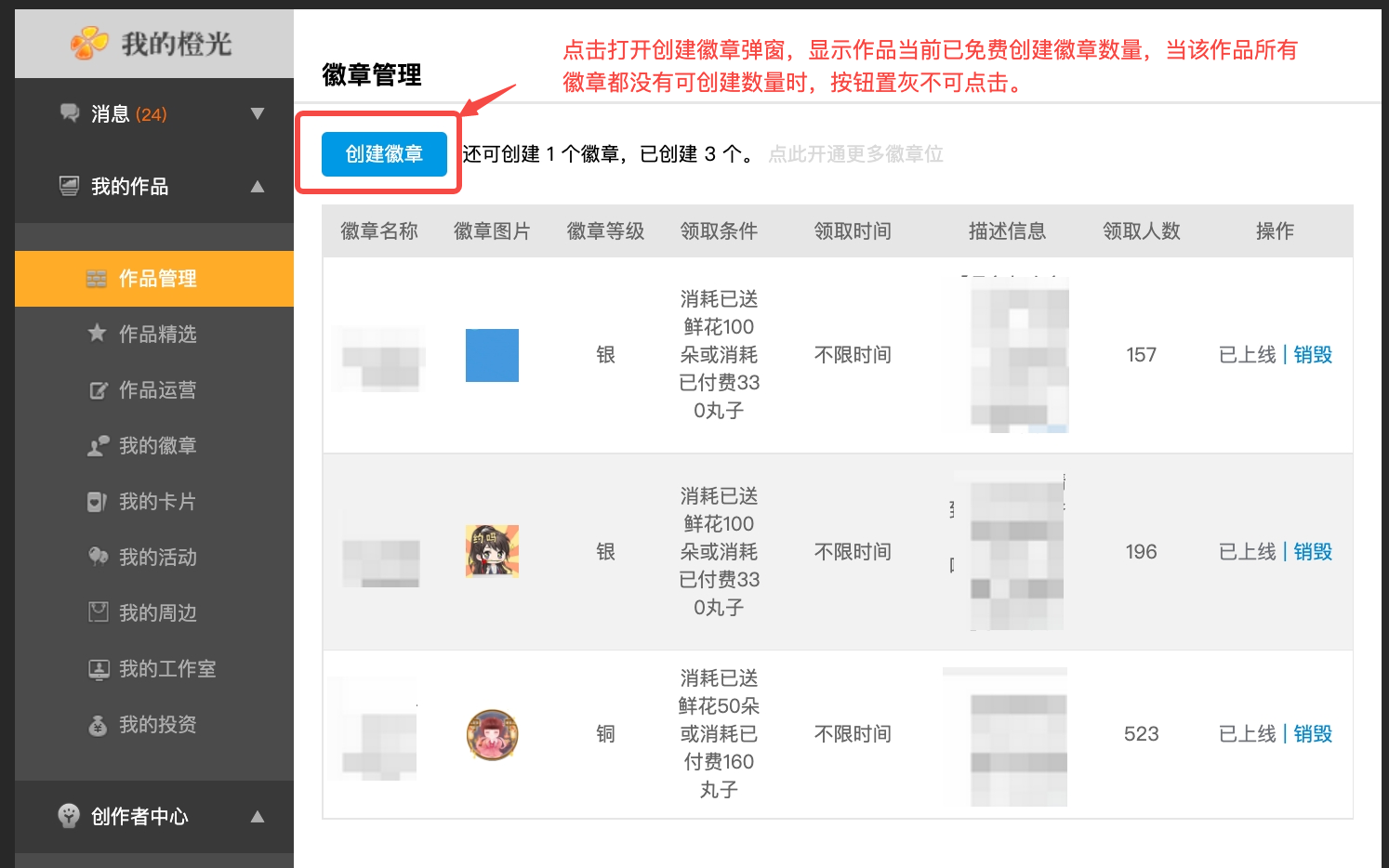 【我的作品】-【作品管理】-【创建徽章】