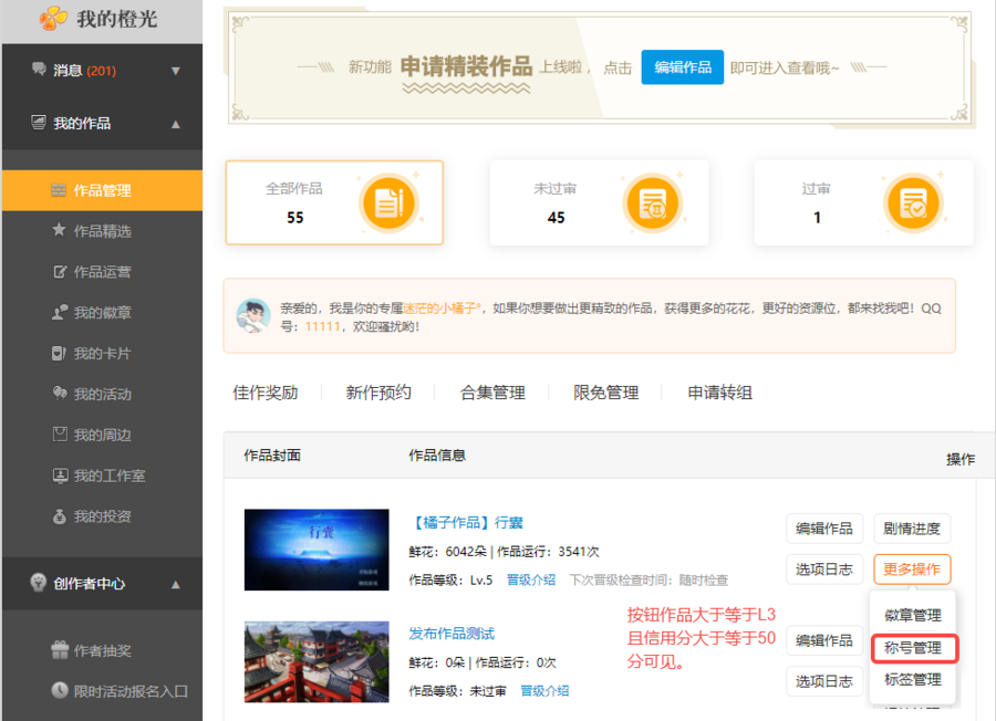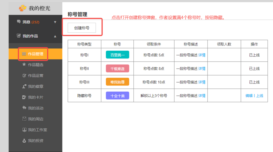 【我的作品】-【作品管理】-【称号管理】-【创建称号】