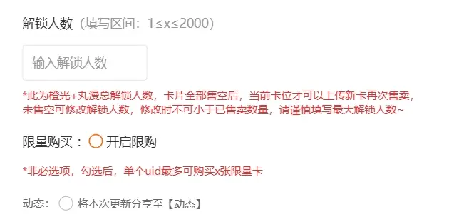 (2)需要设置解锁人数,此为橙光+丸漫总解锁人数,卡片全部售空后,当前卡位才可以上传新卡再次售卖。