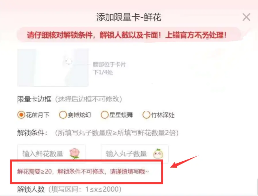 (1)可自定解锁的鲜花和丸子价格,一旦设定不可更改(王牌作者限量卡解锁鲜花数最低价需大于等于20花)