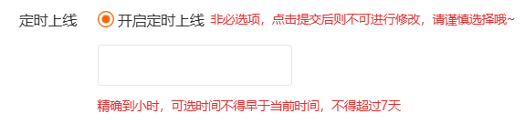 ①定时上线功能精确到小时,可选时间不得早于上传限量卡时间,不得超过7天,比如1.2号10:05分上传限量卡,可选择1.2号11点-1.9号24点的时间。