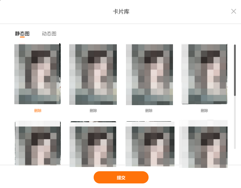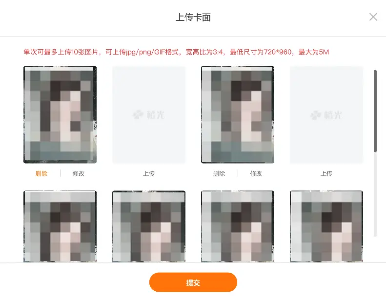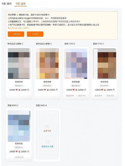 (1)「上传卡面」:作者可点击【上传卡面】,在弹出页面上传静态图、动态图,单次上传上限10张,上传后同步到编辑审核后台,编辑审核通过后上传内容同步展示到卡片库。